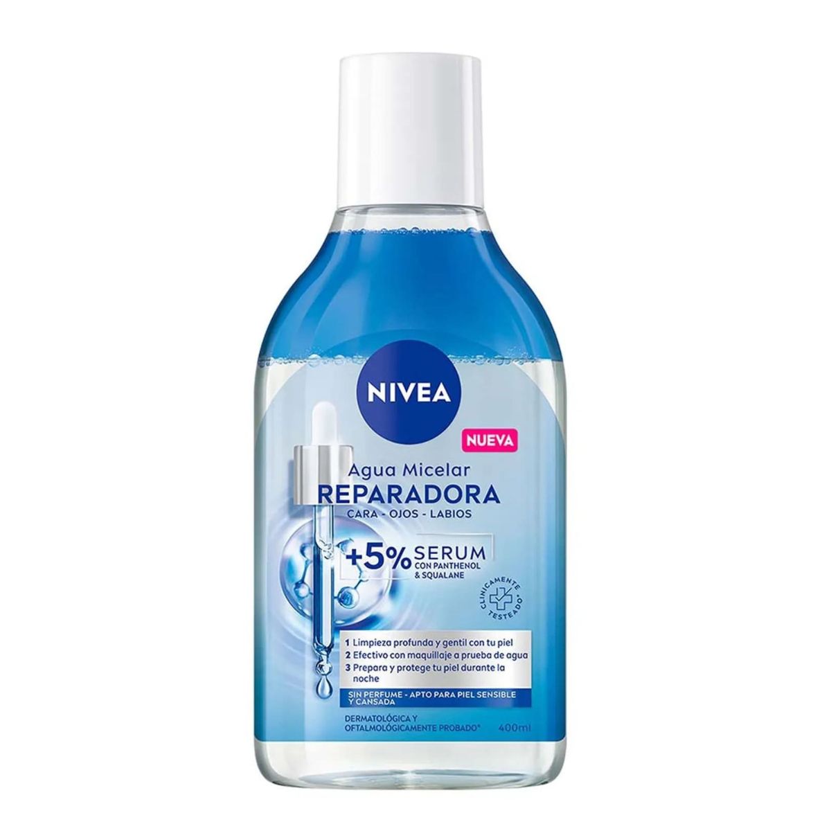 NIVEA Agua Micelar Regeneradora para pieles cansadas y sensibles contiene un 5% de Sérum con Pantenol y Escualeno y elimina eficazmente el maquillaje resistente al agua, las impurezas y la suciedad con unos pocos toques. Restaura la hidratación y regenera, preparando la piel para su regeneración durante la noche.