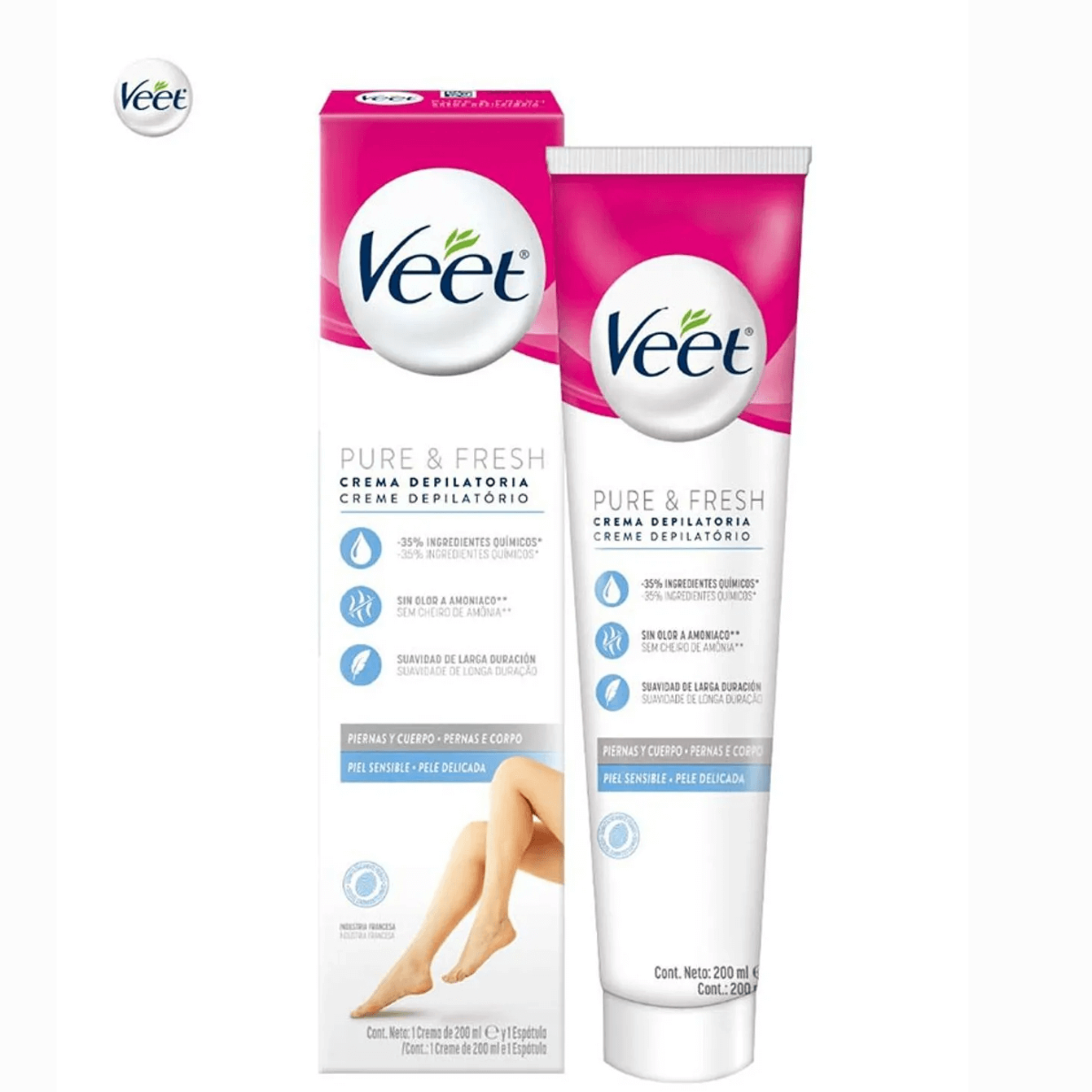 Nueva formulación de Veet más Pure & Fresh. Crema Depilatoria para pieles sensibles con contenido de 200 ml con menos de 35% ingredientes químicos, sin olor a amoníaco, suavidad de larga duración, diseñado para usarlo en piernas, bikini, brazos y axilas